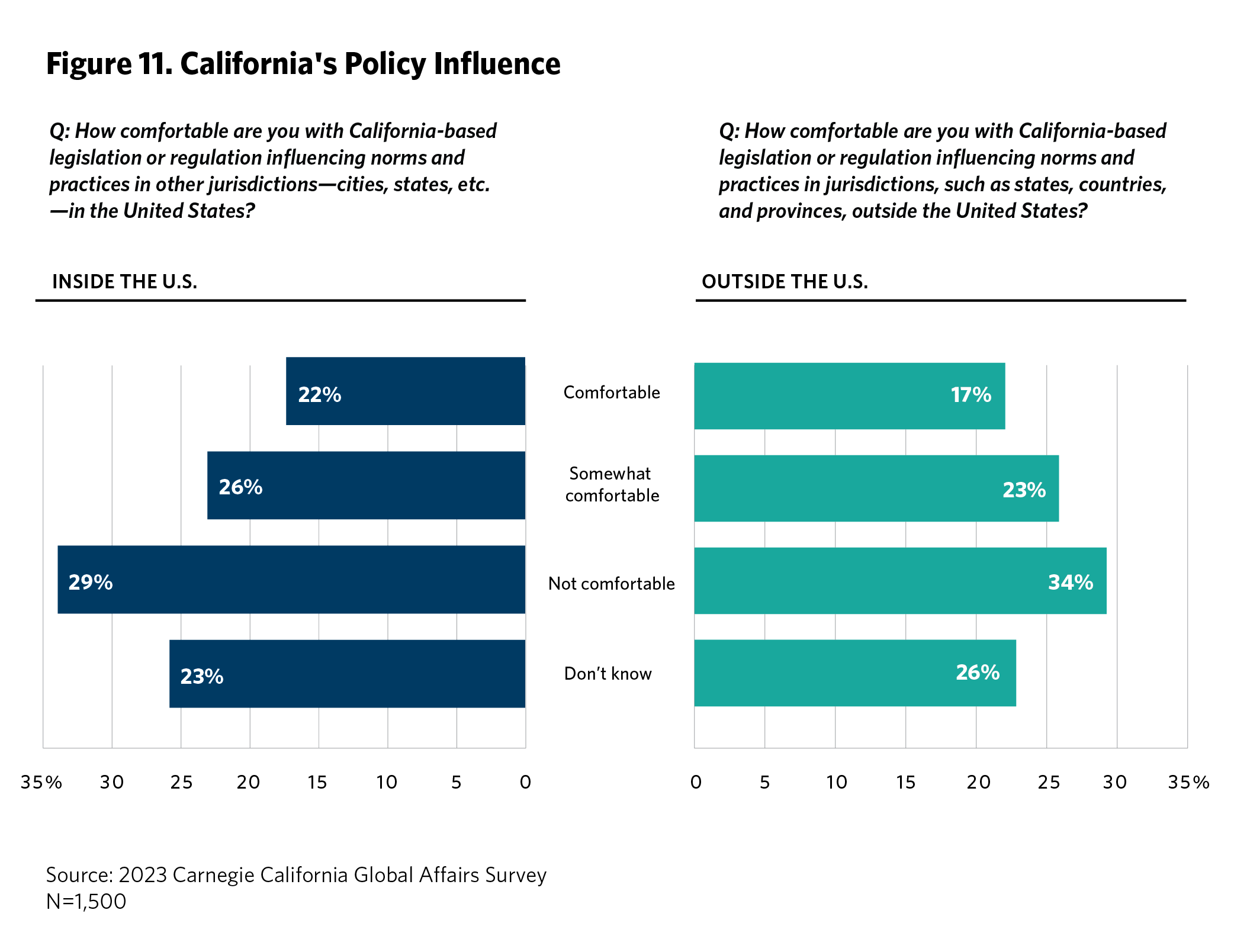 Historically, California policy innovation and implementation has influenced, whether directly or through market mechanisms, other jurisdictions within the United States. This phenomenon, known as the “California Effect,” has had bearing on everything from car emission standards to pork and poultry farming practices. Forty-eight percent of Californians are comfortable or somewhat comfortable with California-based legislation or regulation influencing norms and practices in other jurisdictions in the United States (see figure 11). More than 70 percent of surveyed Democrats are comfortable or somewhat comfortable with extrajurisdictional influence, while 57 percent of surveyed Republicans were not comfortable with such influence.